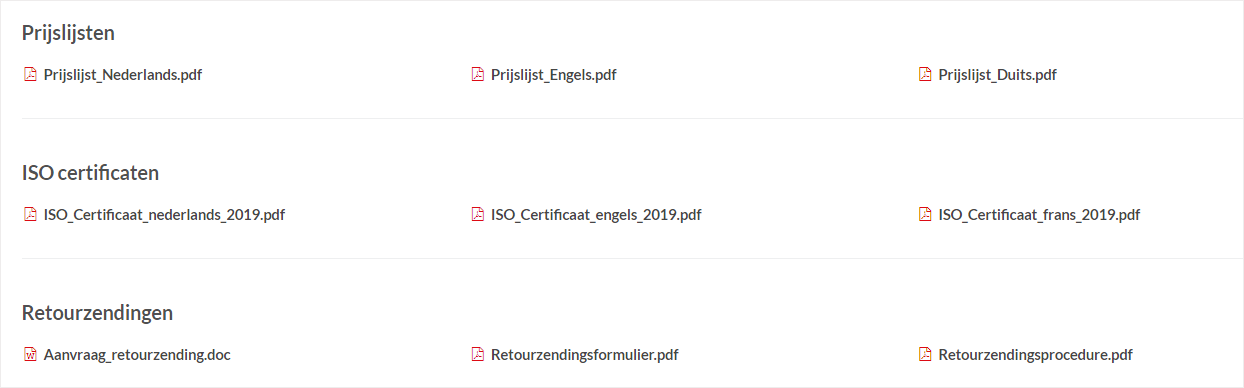 Door op uw website ook een speciale downloadpagina (naast de downloads op de artikelpagina’s zelf) op te zetten weten uw klanten direct waar ze al hun informatie kunnen vinden, en hoeven ze niet eerst het gehele assortiment te doorzoeken. Met als positief gevolg dat de verkoopdienst wordt ontlast omdat de klanten het antwoord online kunnen vinden. Eén centrale plek zorgt dus voor een gebruiksvriendelijke ervaring met voordeel voor alle partijen.