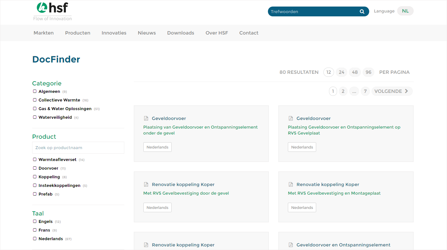 Ook het automatiseren van de downloadpagina is mogelijk. Zo werken bijvoorbeeld Flamco en HSF met de ‘Docfinder’; een online downloadpagina waar ook in gezocht en gefilterd kan worden. De documenten en structuur van de Docfinder worden beheerd in een externe bron die de gegevens gemakkelijk naar de website exporteert.