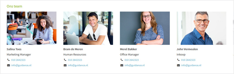 Niets geeft meer vertrouwen dan letterlijk kunnen zien wie de mensen achter het bedrijf zijn. Een pagina met foto’s van alle medewerkers, inclusief functieomschrijving en contactgegevens is een prachtige aanvulling op uw website. Tevens maakt u de drempel om contact op te nemen ook direct lager.