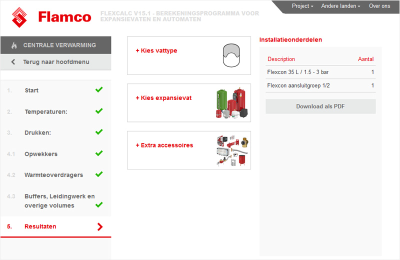 Op basis van ingevoerde gegevens berekent de tool de juiste configuratie van het expansiesysteem en worden de benodigde producten en accessoires getoond met de mogelijkheid om deze direct te bestellen. Ook kan de gebruiker een uitgebreide pdf downloaden met daarin alle informatie waaronder de installatiegegevens, berekeningsresultaten en geselecteerde producten met alle bijbehorende informatie.