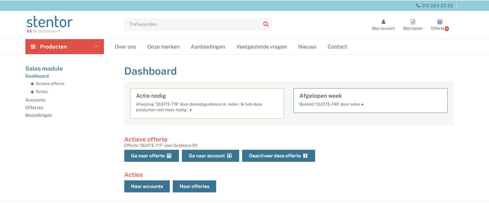 Voor de verkopermedewerker is een dashboard aanwezig waarop in één oogopslag is te zien voor welke offertes een actie nodig is, en welke offertes die afgelopen week als order zijn geplaatst. Door te klikken op een offerte komt de inhoud van de offerte meteen in beeld. Daarbij wordt ook een log overzicht getoond, met alle acties met betrekking tot de offerte tot nu toe.