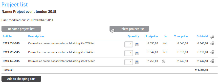Projectlijsten zijn handig voor uw klanten met speciale of klantspecifieke projecten. De benodigde producten kunnen zij alvast verzamelen, waarbij ze ook een overzicht hebben van de kosten. Bij doorgang van het project kan uw klant de projectlijst in één keer toevoegen aan zijn winkelmand en de bestelling plaatsen.