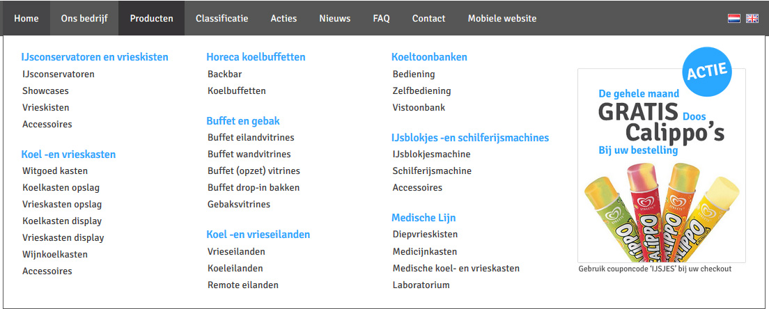 Plaats vanaf nu ook een afbeelding in het uitklapmenu om bijvoorbeeld een artikel of actie extra te promoten. Aan de afbeelding kan ook een link worden toegevoegd. Op onze demo website hebben we deze ruimte gebruikt om onze coupon actie onder de aandacht te brengen.