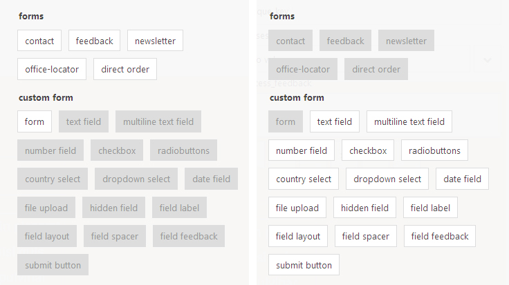De webeditor componenten picker is verbeterd met een duidelijkere indeling. De custom form componenten zijn nu bijvoorbeeld alleen maar te plaatsen binnen een custom formulier.