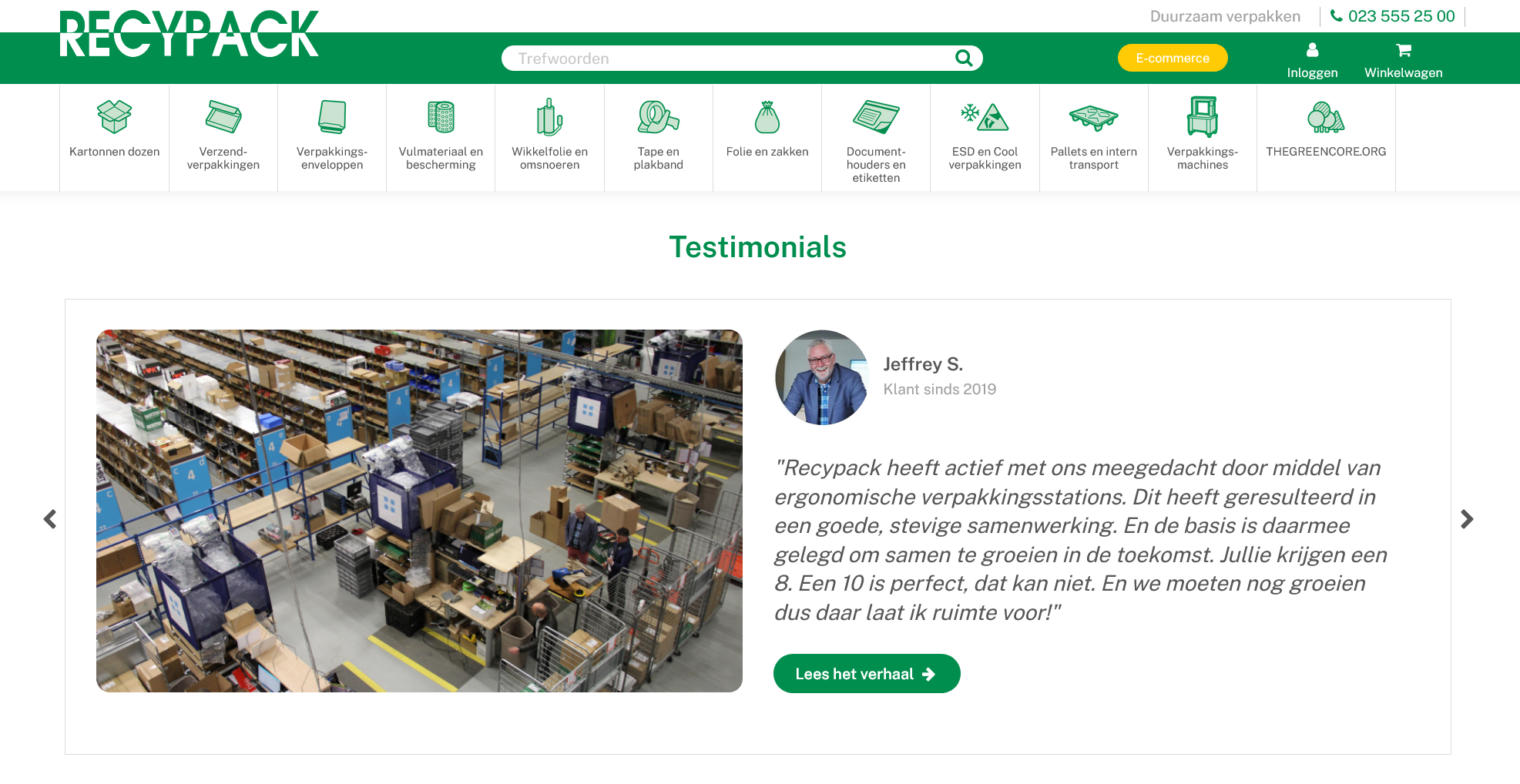Recypack zet vooral in op testimonials. Deze worden op de homepage belicht, maar er is ook een aparte pagina waar alle testimonials terug te vinden zijn. Dankzij de naam en foto van de klant in combinatie met de quote komt het verhaal overtuigend en betrouwbaar over. Een leuke toevoeging is het jaartal waarin de persoon een vaste klant werd.
