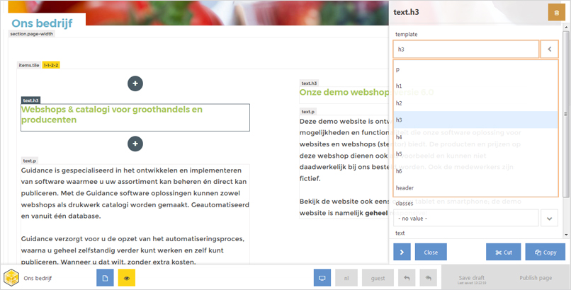 Elke huisstijl is anders, en heeft zo zijn eigen stijl- en sfeerelementen die de website bijzonder maken. Het kan dan ook voorkomen dat de website speciale elementen nodig heeft die niet standaard in de webeditor aanwezig zijn. Denk bijvoorbeeld aan een schuin hoekje over een afbeelding, of een decoratieve strook in verschillende (huisstijl)kleuren. Geen probleem, ook hiervan kunnen elementen (door Guidance, tijdens het opzetten van de website) worden aangemaakt waarna ze via de editor geplaatst kunnen worden.