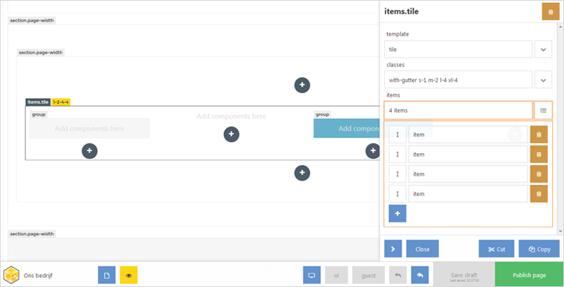 Met de kolommen en tegels kan zelf bepaald worden hoe de informatie weergegeven wordt. 2, 3, 4 of 10 kolommen naast elkaar, het kan allemaal. Past het niet meer naast elkaar? Dan kunnen er eenvoudig elementen aan de boven- en onderkant worden bijgevoegd door middel van het + icoon. Of bouw verder met nieuwe stroken, in een ander kleurtje bijvoorbeeld.