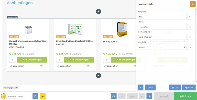 Ook voor het onder de aandacht brengen van de producten is er veel mogelijk. Producten en aanbiedingen kunnen eenvoudig in de spotlights gezet worden, op elke pagina die je wenst. Zo zijn er elementen waarmee een rijtje met aanbiedingen en acties kunnen worden geplaatst, en elementen waarmee de merken in één overzicht worden weergegeven. Ook een afzonderlijk product kan op deze manier geplaatst worden, inclusief een button zodat je klant het product direct in de winkelmand kan plaatsen.