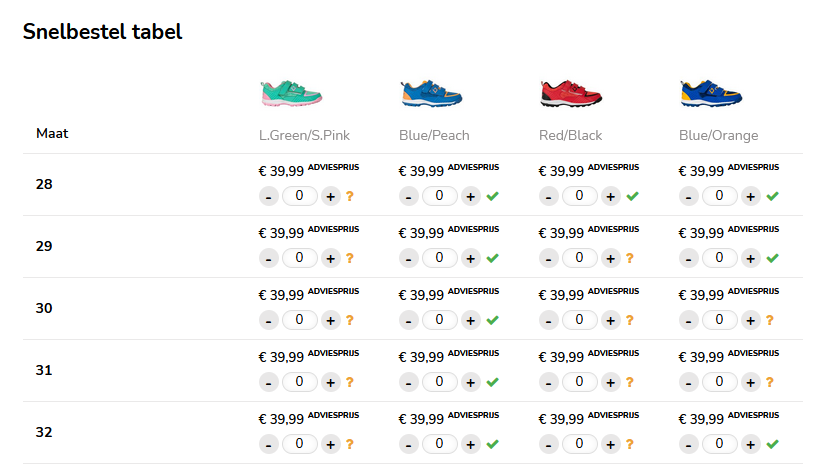 Voor grote orders is er een gebruiksvriendelijke tool om uw afnemers extra snel te laten bestellen. In de 'snelbestel' tabellen staan alle uitvoeringen (bijvoorbeeld maten of kleuren) van de producten naast elkaar. De gewenste aantallen kunnen per uitvoering worden ingevuld, en vervolgens kan alles in één keer in de winkelwagen geplaatst worden.