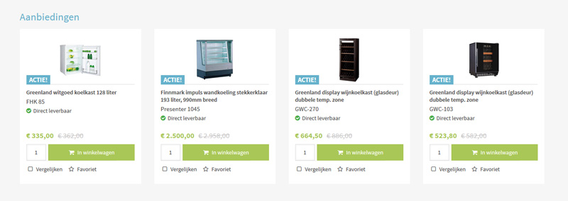 Geef de bezoeker alvast een preview van uw assortiment met een sectie gevuld met artikelen. Denk bijvoorbeeld aan artikelen die nieuw in het assortiment zijn, speciale actie artikelen, meest verkochte artikelen of populaire artikelen. Toon bij de artikelen liefst ook direct de prijs en een opvallende winkelwagen button om de bezoeker aan te sporen tot klikken.