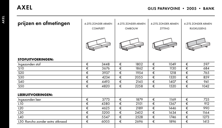 De Montis prijslijsten hebben geen ‘recht toe, recht aan’ opzet, maar bevatten uitgebreide tabellen waar per meubelstuk de verschillende opties en bijbehorende prijzen gemakkelijk af te lezen zijn. Bijvoorbeeld de prijzen van de +10 verschillende stoffen en leersoorten, de prijs wanneer de klant zelf een stof instuurt, meerprijzen voor afneembare hoezen en de verschillende mogelijkheden in poten en onderstellen. Zo kan een stoel bijvoorbeeld worden voorzien van zwart leer met een grijze zitting en een wit rug kussen. Al deze mogelijkheden zijn opgenomen in de tabel, zodat de dealer snel de juiste prijs kan aflezen.