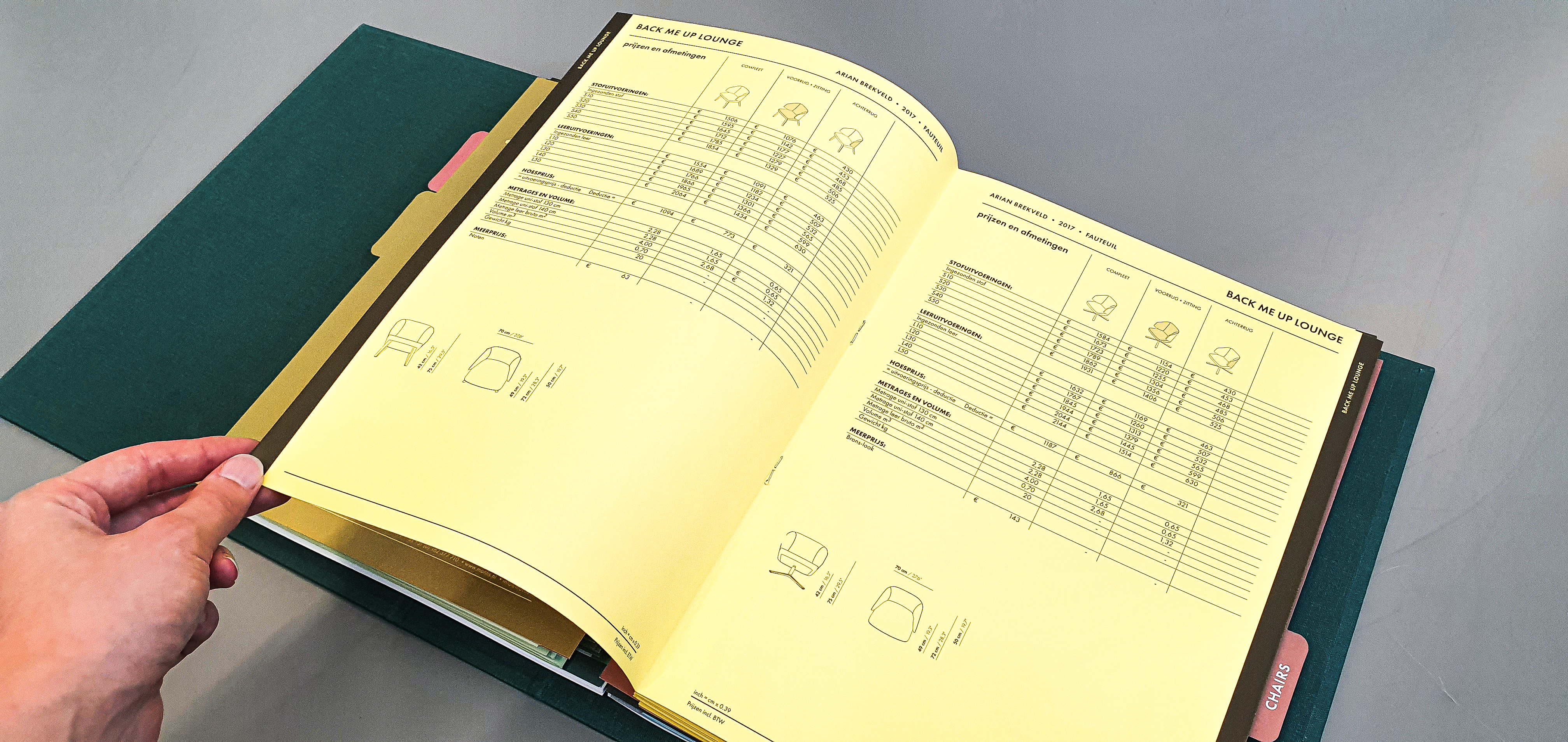 “Het grote voordeel van de map is de herbruikbaarheid” Vertelt Miriam. “elk jaar worden de prijzen geüpdatet en kunnen de dealers de katernen vervangen. En soms komen er halverwege het jaar nieuwe modellen uit; de prijslijsten hiervan kunnen dan ook direct worden toegevoegd. Aangezien de prijslijsten naar meer dan 40 landen worden verstuurd zijn de losse katernen een voordelige en milieuvriendelijke optie.”