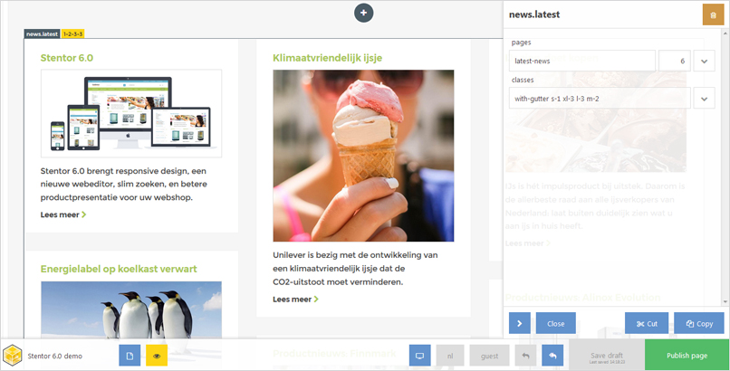De webeditor biedt meer dan alleen het maken van layouts; ook de dynamische content kan gewoon via de webeditor worden toegevoegd. Dit zijn slimme elementen die vooraf al zijn vormgegeven en uit zichzelf data ophalen. Denk bijvoorbeeld aan een element wat de laatst gepubliceerde nieuwsberichten ophaalt, inclusief afbeelding, beschrijving en een link naar het artikel zelf. Of een interactief google maps kaartje met de vestigingslocatie(s) erop. Ook de social media buttons en de bedrijfscontactgegevens staan met één klik op de pagina.