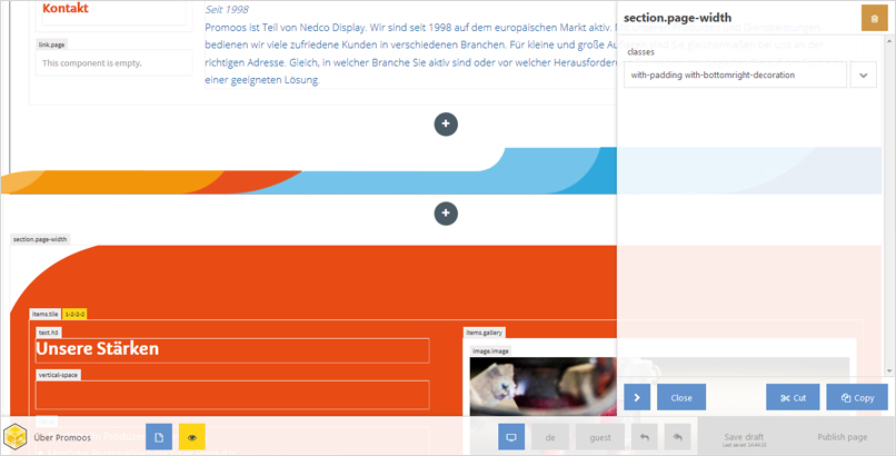 Elke huisstijl is anders, en heeft zo zijn eigen stijl- en sfeerelementen die de website bijzonder maken. Het kan dan ook voorkomen dat de website speciale elementen nodig heeft die niet standaard in de webeditor aanwezig zijn. Denk bijvoorbeeld aan een schuin hoekje over een afbeelding, of een decoratieve strook in verschillende (huisstijl)kleuren. Geen probleem, ook hiervan kunnen elementen (door Guidance, tijdens het opzetten van de website) worden aangemaakt waarna ze via de editor geplaatst kunnen worden.