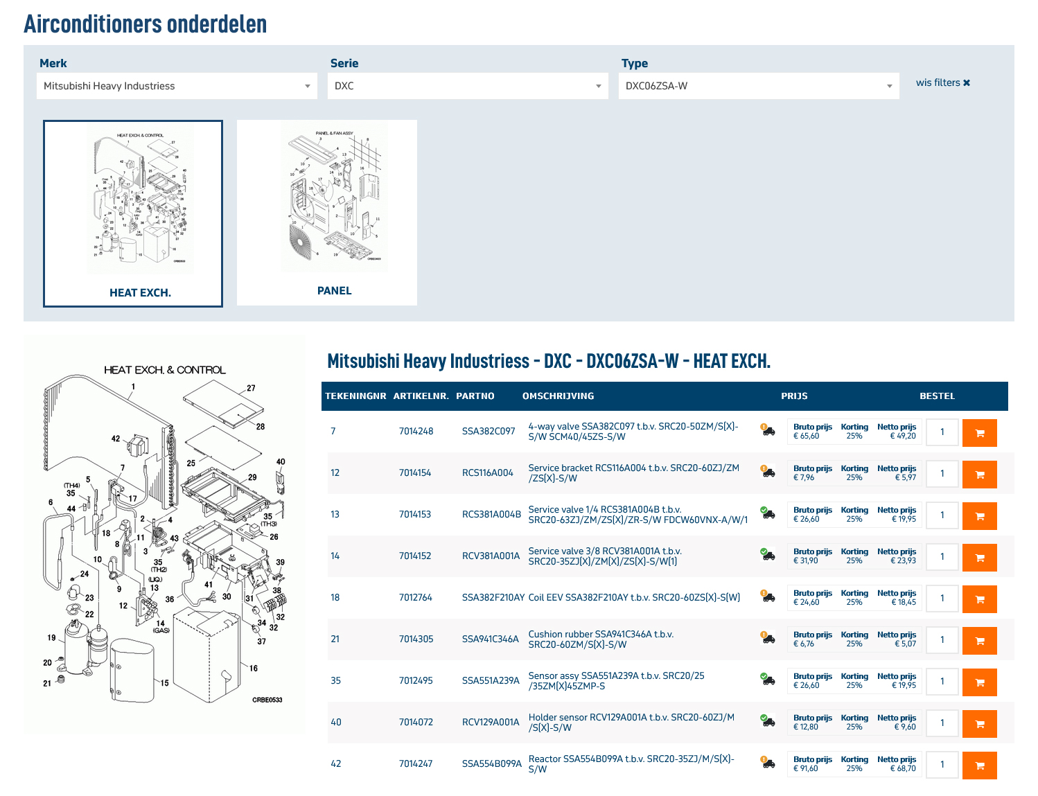 De onderdelen tool werkt eenvoudig; eerst wordt het merk geselecteerd, vervolgens de serie en het producttype. Daarna verschijnt direct een technische tekening waarbij de nummers op de tekening corresponderen met de besteltabel. Ingelogde gebruikers kunnen vanuit de tabel direct het juiste onderdeel in de winkelwagen plaatsen. Het komt natuurlijk niet als een verrassing als we vertellen dat de tool door klanten (en intern) zeer enthousiast is ontvangen. En de automatisering stopt hier niet; de onderdelen worden in het magazijn geautomatiseerd verzameld.