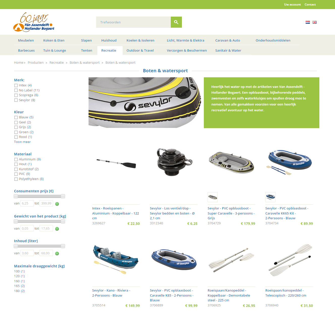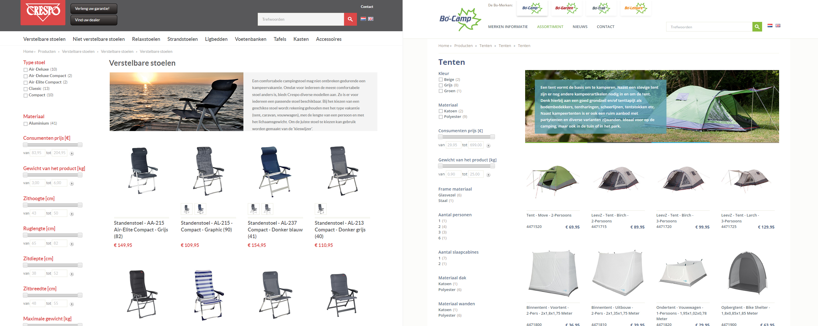 Onze klant Van Assendelft gaat nog een stapje verder in de online promotie van hun producten; vanuit hun centrale Catalogger PIM database sturen zij 3 verschillende websites aan. De grootste website - vahb.nl – bevat het complete assortiment, en speciaal voor de productlijnen van Bo-Camp en Crespo zijn er extra websites gemaakt. Op deze manier kunnen de productlijnen hun eigen branding meekrijgen en zo gemakkelijker hun doelgroep aantrekken.